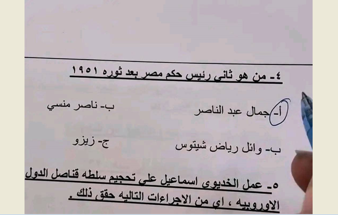 كشفت مصادر مسؤولة بوزارة التربية والتعليم والتعليم الفني، حقيقة ما تم تداوله بشأن ظهور أسماء وائل رياض شيتوس وزيزو وناصر منسي في امتحان مادة التاريخ للثانوية العامة، والذي انتهى من أداءه الطلاب قبل قليل، حيث تم تداول سؤال بعنوان “من هو ثاني رئيس حكم مصر بعد ثورة 1951؟” وكان من بين الاختيارات: “جمال عبد الناصر، وائل رياض شيتوس، ناصر منسي، زيزو”.