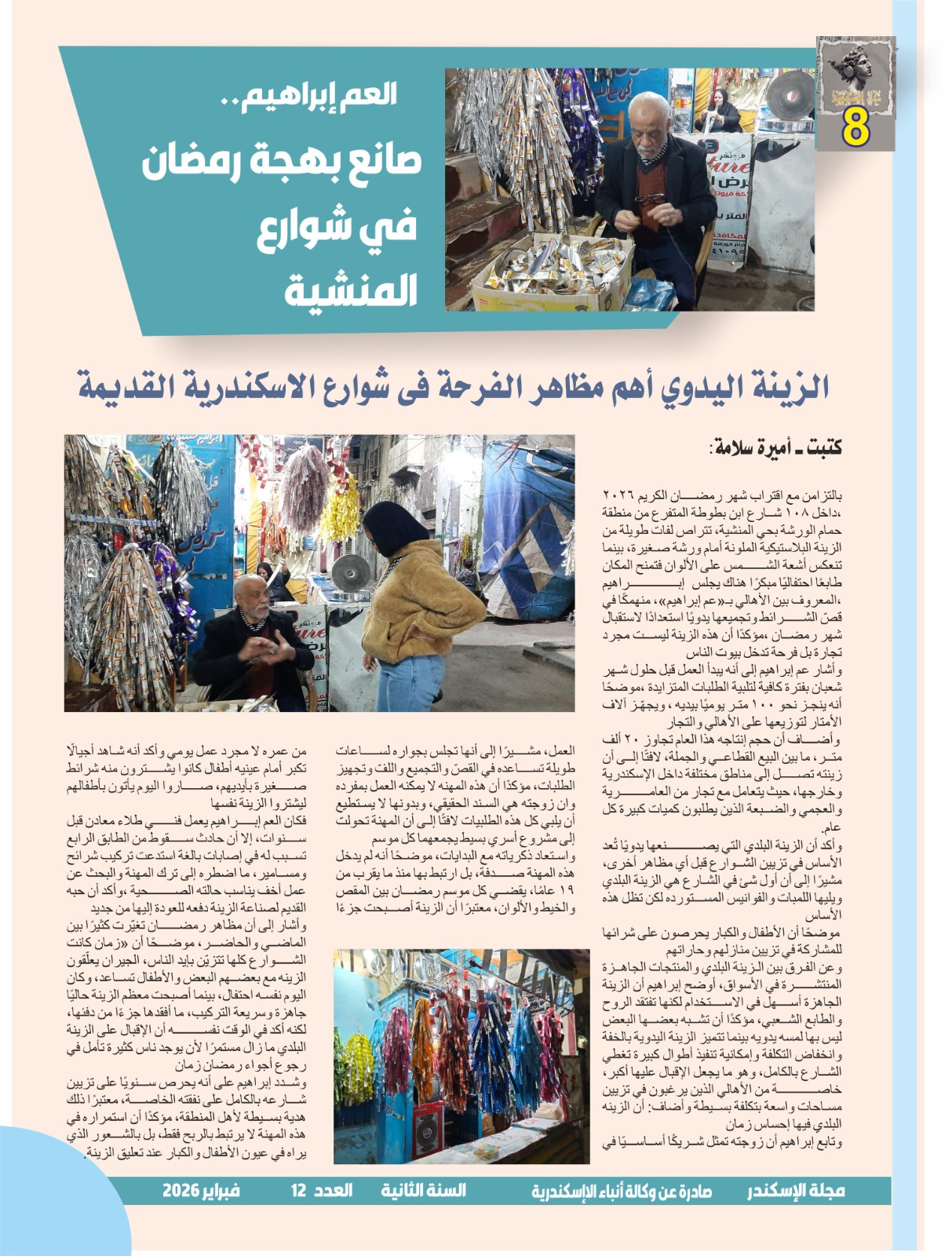 بالتزامن مع اقتراب شهر رمضان الكريم 2026 ،داخل 108 شارع ابن بطوطة المتفرع من منطقة حمام الورشة بحي المنشية، تتراص لفات طويلة من الزينة البلاستيكية الملونة أمام ورشة صغيرة، بينما تنعكس أشعة الشمس على الألوان فتمنح المكان طابعًا احتفاليًا مبكرًا هناك يجلس إبراهيم ،المعروف بين الأهالي بـ«عم إبراهيم»، منهمكًا في قصّ الشرائط وتجميعها يدويًا استعدادًا لاستقبال شهر رمضان ،مؤكدًا أن هذه الزينة ليست مجرد تجارة بل فرحة تدخل بيوت الناس
