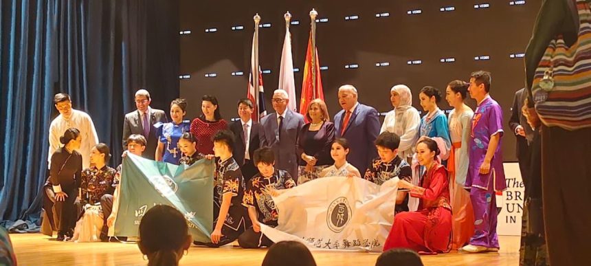 وألقى السفير علي الحفني، نائب رئيس الجمعية، كلمة رحّب خلالها بعدد من الشخصيات البارزة، من بينهم الدكتورة دوان تشي جيه ممثلة المكتب التعليمي بالسفارة الصينية بالقاهرة، والدكتور ضياء حلمي عضو المجلس المصري للشئون الخارجية، إلى جانب السيد شاو يين عميد معهد الفنون الشعبية بجامعة سيتشوان، والسيدة يانغ يويه المديرة المسؤولة عن الفرقة. كما أعرب عن تقديره للدكتورة شادية فهيم، عميدة كلية الآداب والعلوم الإنسانية بالجامعة البريطانية، على دعوتها الكريمة للمشاركة في هذا الحدث.