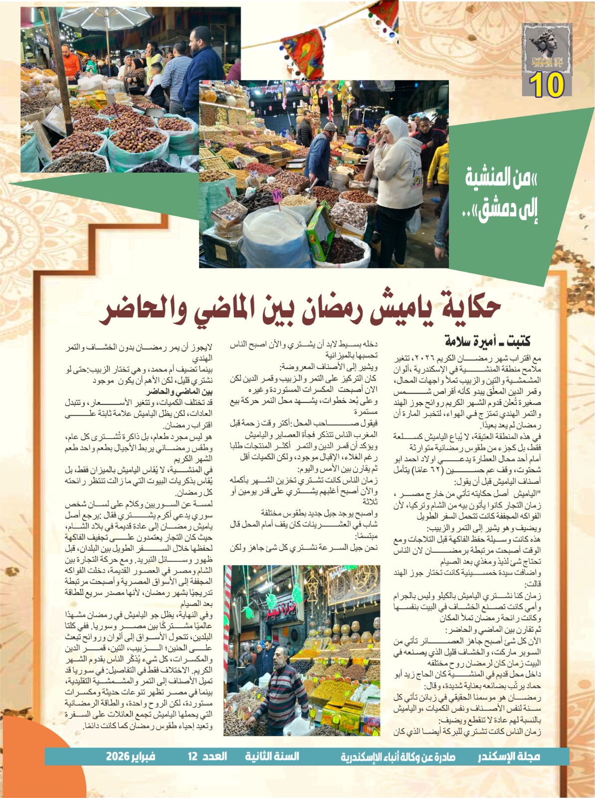 مع اقتراب شهر رمضان الكريم 2026، تتغير ملامح منطقة المنشية في الإسكندرية ،ألوان المشمشية والتين والزبيب تملأ واجهات المحال، وقمر الدين المعلّق يبدو كأنه أقراص شمس صغيرة تُعلن قدوم الشهر الكريم روائح جوز الهند والتمر الهندي تمتزج في الهواء، لتخبر المارة أن رمضان لم يعد بعيدًا.