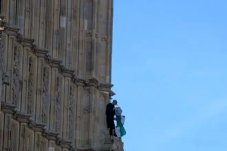 رجل يتسلق برج إليزابيث في لندن ويرفع علم فلسطين